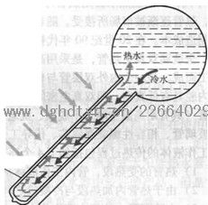 真空集熱管的內(nèi)玻璃管的外表面上利用特種工藝涂有具有光譜選擇性功能的 吸收涂層,該涂層對(duì)太陽(yáng)光有選擇性吸收,其吸收比為0.92,發(fā)射比矣0.09 (80T),具有高吸收率和低發(fā) 射率。經(jīng)太陽(yáng)光照射,光子撞 擊涂層,太陽(yáng)能轉(zhuǎn)化為熱能,水從涂層處吸熱,水溫升高,密度減小,熱水向上運(yùn)動(dòng),而 比重大的冷水下降,熱水始終 位于上部,即儲(chǔ)水箱中Q在集 熱器和儲(chǔ)水箱中,因?yàn)樗疁夭?同而產(chǎn)生密度差,形成自然對(duì)真空集熱管流,溫度相對(duì)較高的水不斷進(jìn) 人太陽(yáng)能儲(chǔ)水箱,如圖1-4所示